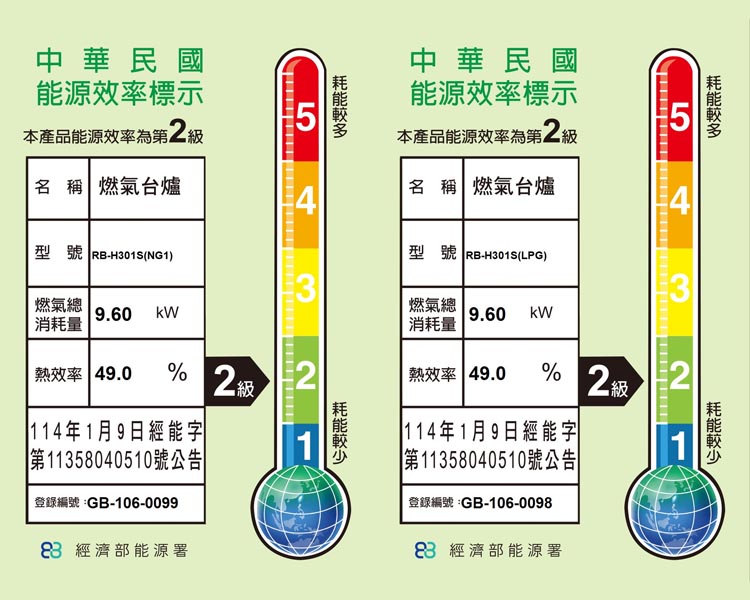 | 標示熱效率 | 液化 49.0% 天然氣 49.0% |