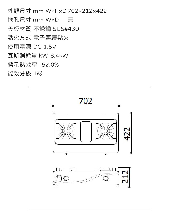 瓦斯爐:購買前請先確認--住家使用瓦斯類型、安裝位置尺寸大小、商品顏色,一經安裝恕不退換。