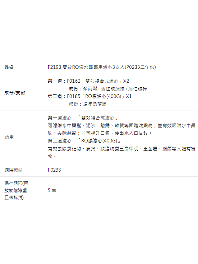 F2193 雙效RO淨水器專用濾心3支入(P0233二年份)