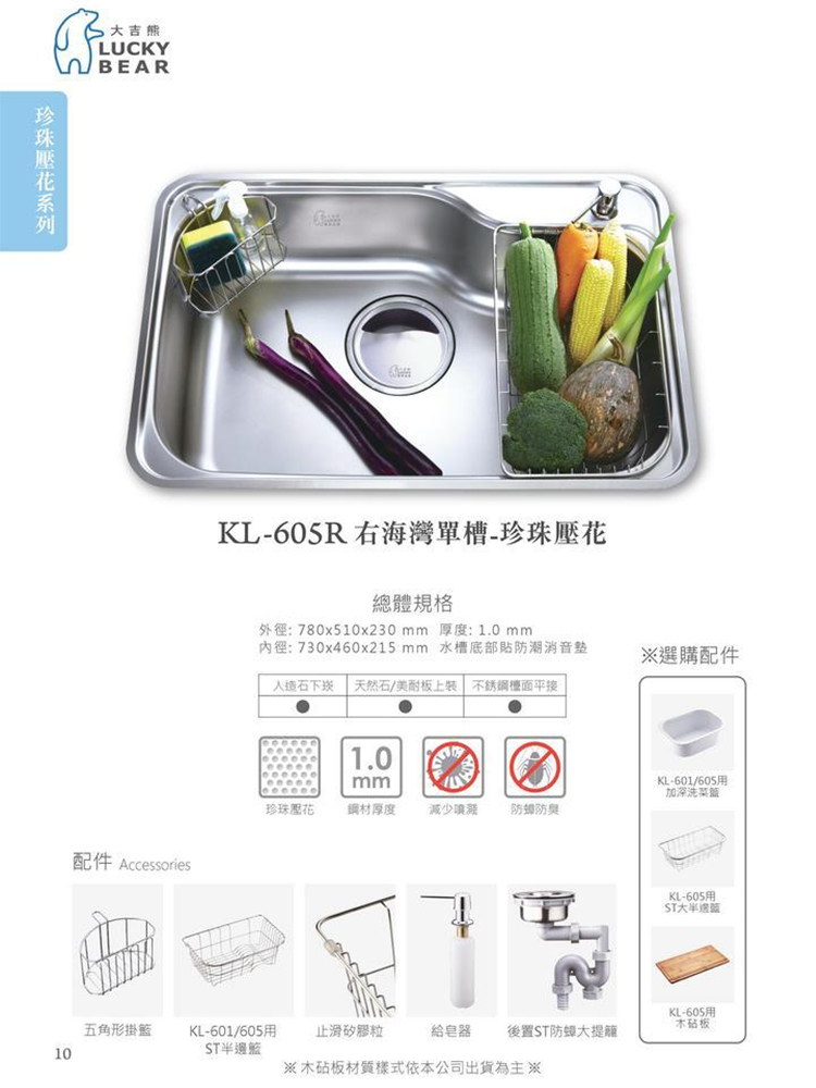 【大吉熊】右海灣單槽(珍珠壓花)-KL-605R-無安裝服務