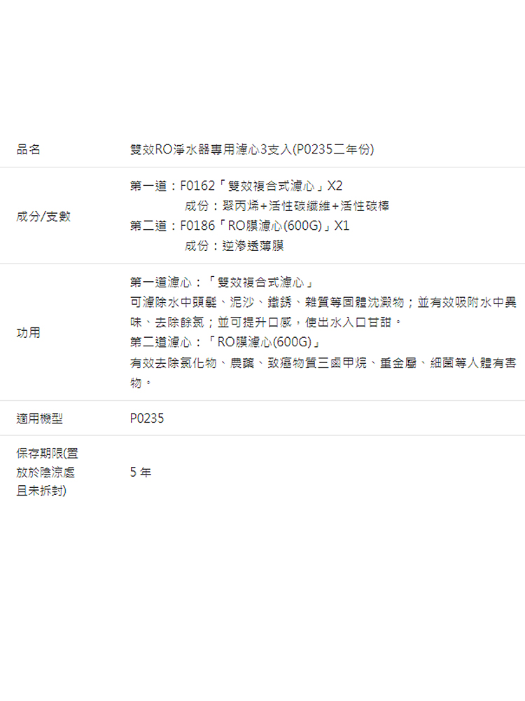 雙效RO淨水器專用濾心3支入(P0235二年份)